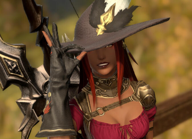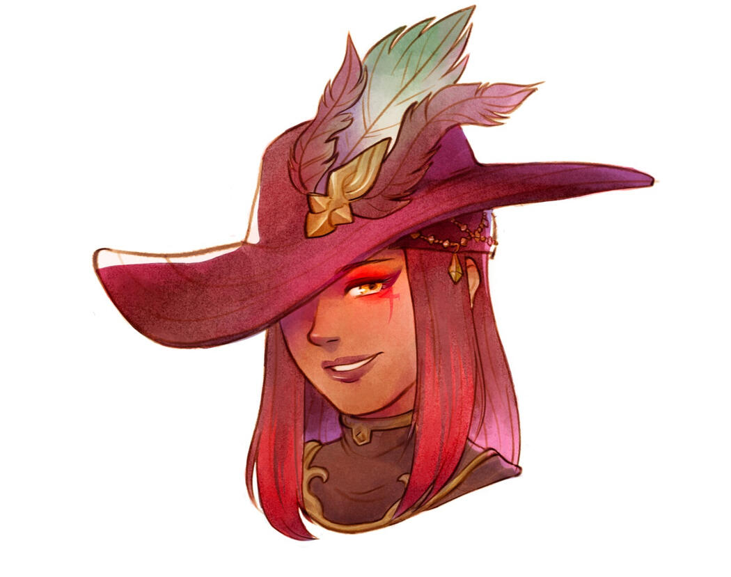 Faye is a young Midlander woman, lithe in build and tan of complexion. She sports a shock of dusk-mauve hair, with the occasional lock dipped in sunset orange; only the keenest eyes might detect the mousy roots, usually kept at bay through regular administration of homemade dyes. Almond-shaped eyes, halfway betwixt honey and hazel in color, oft peer up from 'neath the brim of one of her many hats - a piece of clothing she seems to be especially fond of, given the vast collection of berets, bonnets, hoods and feathered chapeaus lovingly stored in her traveling cart.Once prone to wander Eorzea and go wherever the wind blew, the self-proclaimed Nightingale of Gridania has long since found her nest. She's now oft to be seen by the side of Odilon Sauvagerlain, previously her bitterest rival, currently - by a whim of fate - her flamboyant husband.A Gridanian through and through, Faye is known to respect life in its every facet; and though she fully understands that nature is oft a cruelest teacher, she nonetheless remains a pacifist at heart, wont to frown upon barbarity and bloodshed - in particular when she deems them reasonably avoidable.